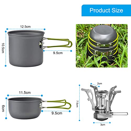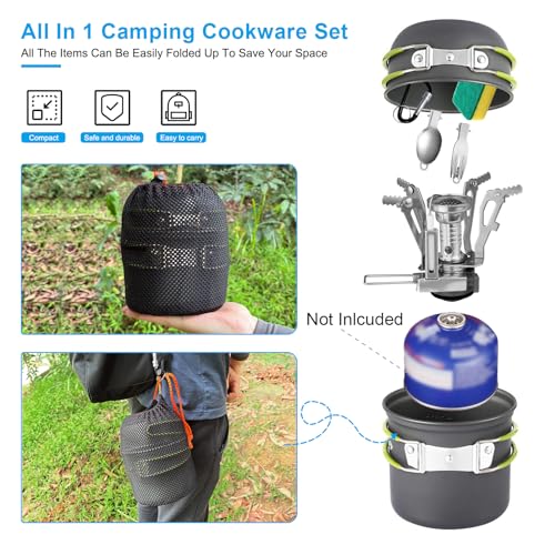 - The portable camping cooking utensils set including: 2 * non-stick pots + 1 * mini camping stove + 1 * folding spoon + 1 * folding fork + 1 * sponge cleaning brush + 1 * stove storage box + 1 * carabiner + 1 * mesh bag+ 1 * user manual. It is perfect for 1-2 people outdoor camping.