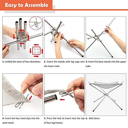 - The 304 stainless steel mesh is sturdy, durable and anti-heating, which is hard to damage and reusable. The 0.96mm heat-resistant mesh of our foldable fire pit, making ash or debris not fall and easy to clean. Enjoy your BBQ relaxing and pleasant time, we will handle all inconvinience for you!
